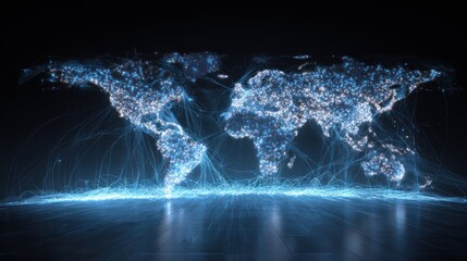 Luminous world map visualization with network connections on a dark background, concept for global communication network, technology infrastructure and worldwide data sharing