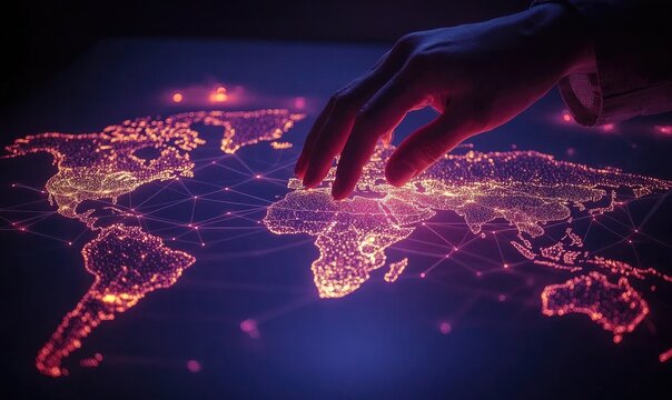 Hand hovering over a digital world map, highlighted with glowing connections