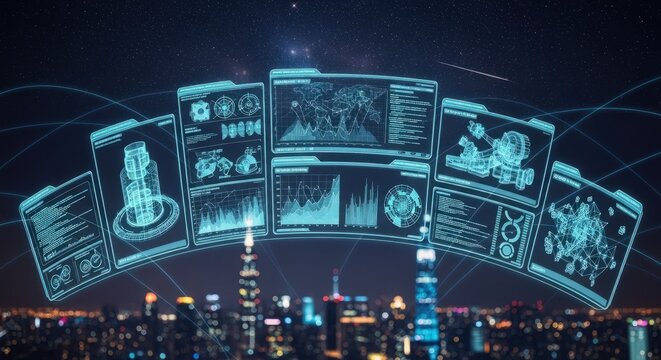 Futuristic city with transparent panels displaying data over a modern skyline at sunset