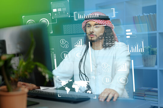 Modern Technology and Global Networking in Business with Futuristic Graphics and Human Interaction in Office Environment