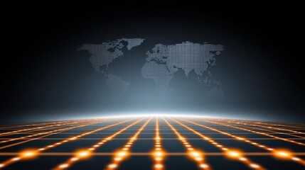 Abstract Digital Landscape with World Map Background and Glowing Grid Pattern for Futuristic Technology and Virtual Reality Concepts