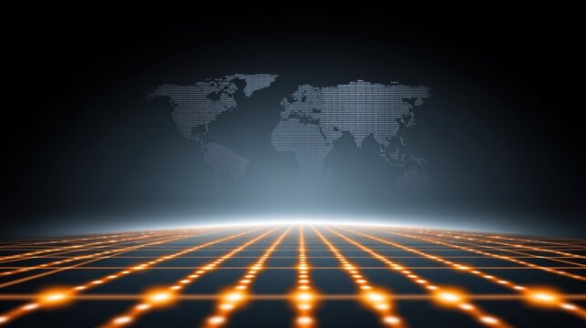 Glowing digital world map with connected dots, representing global networking