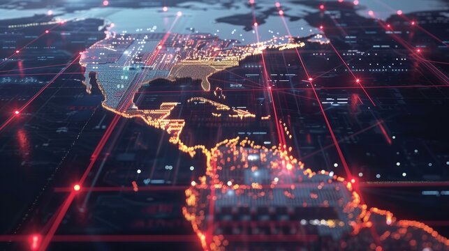 Global transport routes visualized with AI data overlays, showing realtime logistics efficiency