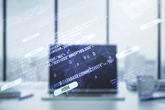 Abstract creative coding concept with world map on modern laptop background. Multiexposure
