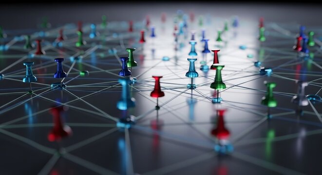 Dynamic network of colorful pins connected by luminous lines representing global connectivity and data flow