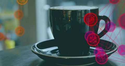 Black ceramic coffee cup with froth and red network nodes overlay for tech concept
