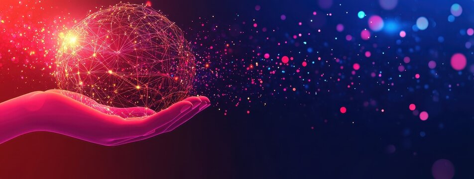 Close-up of a vibrant, abstract digital sphere with interconnected nodes and glowing red and purple lights, symbolizing connectivity and modern technology concepts.
