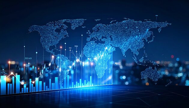 Visual representation of global financial markets with world map and illuminated bar graphs depicting data trends.