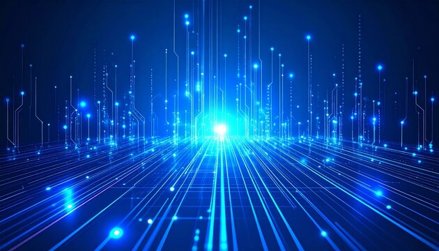 Abstract futuristic technology background with glowing blue digital data streams and network connections on a circuit.