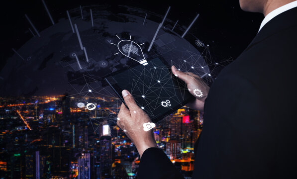 Hands typing on a laptop, surrounded by global digital network interface elements