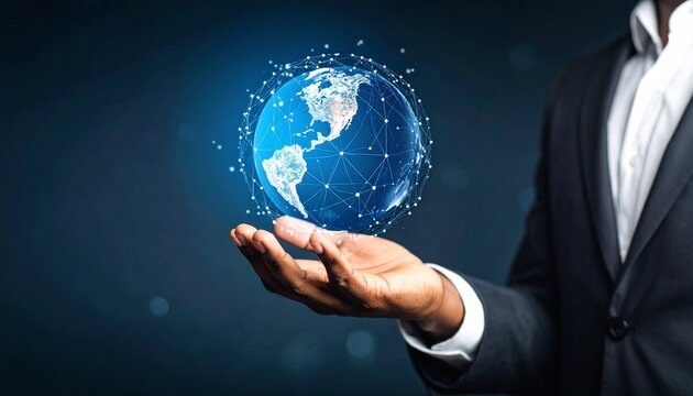 A scene in which a man raises his hand and a digital globe-shaped object rotates in his palm