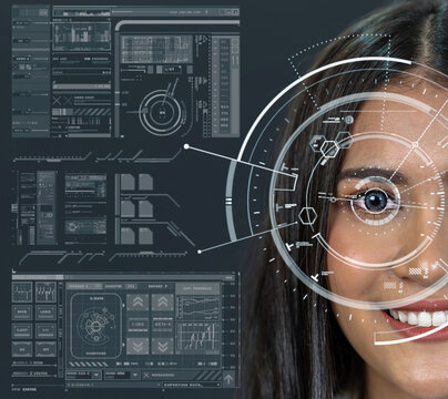 Asian women being futuristic vision, digital technology screen over the eye vision background, security and command in the accesses. surveillance and sefety concept