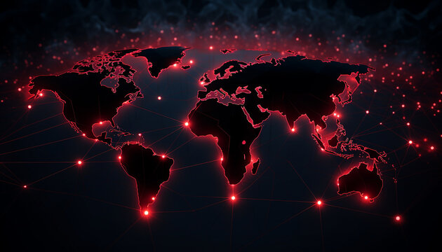 Abstract glowing digital world map with connection points. Dark background with red highlights representing global network connections.