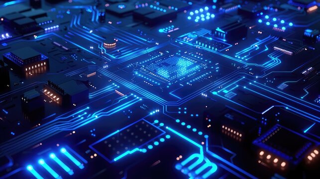 3D abstract digital circuit design in blue, with glowing pathways and chip patterns, representing technological innovation