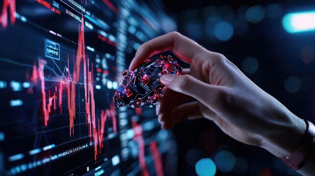 Futuristic computer circuit board with digital data overlay