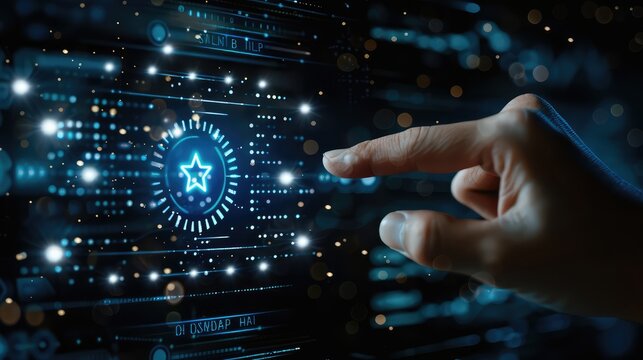 Digital Five-Star Quality Rating. Hand pointing to a five-star digital rating on a virtual interface