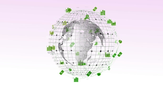 Image of changing numbers, profile icons, spinning globes of digital icons on green background