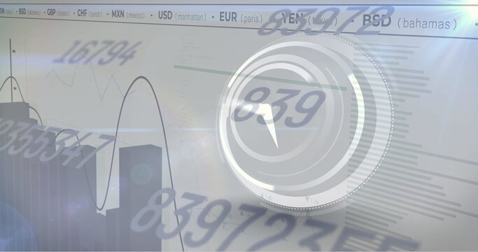 Image of diverse data and clock over caucasian female and male colleagues talking in office