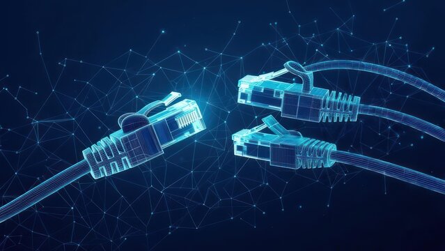 Network cables, glowing blue, connected, abstract.  Digital lines connect network plugs
