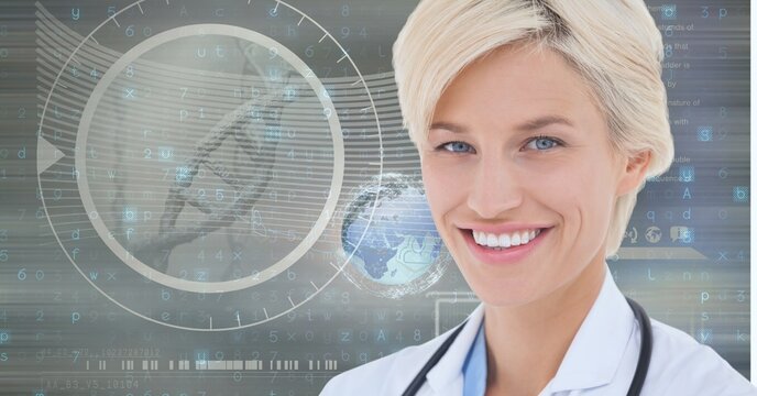 Image of dna strand, mathematical formulae and scientific data processing over grey background