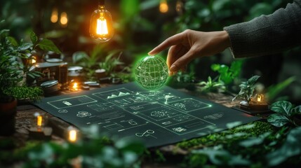 Hand holding glowing globe over eco-friendly tech plan.