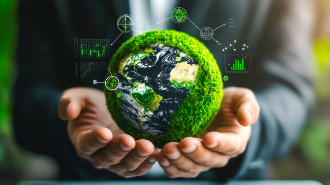 A businessman holding an Earth globe with green moss and carbon capture icons floating above it, surrounded by virtual graphs concept of net-zero greenhouse emissions.
