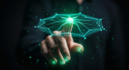 A human finger interacts with a glowing, futuristic digital network interface, symbolizing connection and data.