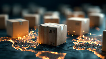 A futuristic scene featuring cardboard boxes in fron of a digital world map, rpresenting logistics, shiping, and global trade.