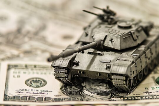 A model tank rests on American currency, symbolizing the economic implications of military spending and defense.