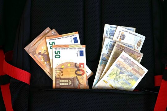 Euro and Bulgarian lev banknotes stored together in backpack compartment for travel or savings. Concept of dual currency, financial planning, EU expansion, currency transition