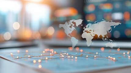 digital world map with trade routes and data points is displayed on blurred background, symbolizing global connectivity and technology. image conveys sense of innovation