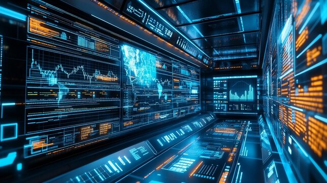 Futuristic digital trading room with glowing blue screens displaying stock market data, charts, and global financial information in a high-tech environment.