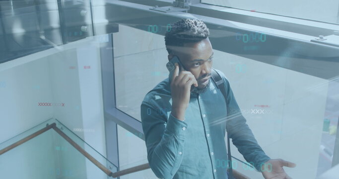 Image of data processing over african american businessman using smartphone