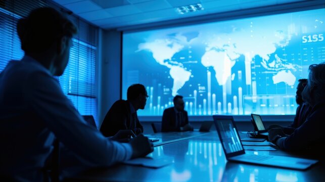 Silhouettes of businesspeople in a meeting room with a large screen displaying a global financial data map.