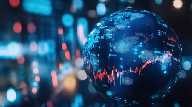A digital globe displays a declining stock market trend with a red line, symbolizing economic downturns and global financial metrics.
