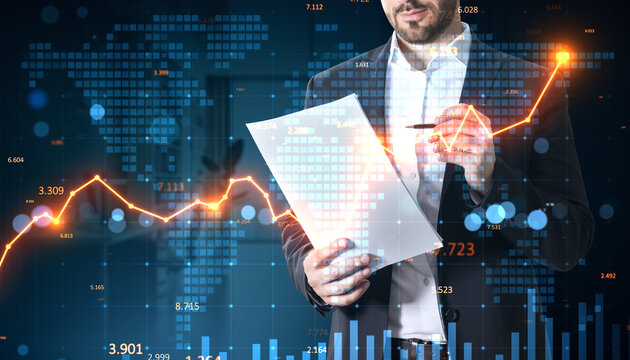 Businessman analyzing financial paper with glowing graph overlay on digital world map background in modern financial market concept scene.