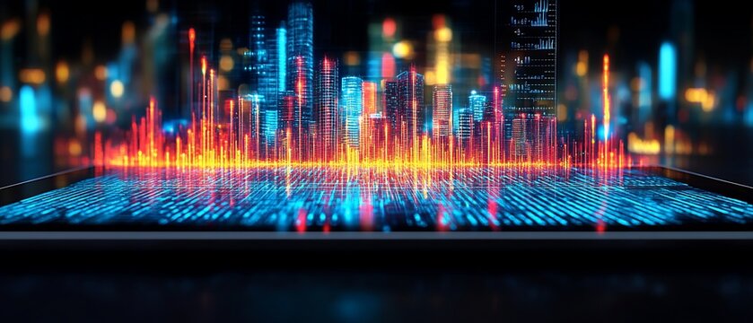 Global financial data analytics with urban skyline background