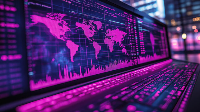 vibrant forex chart background featuring world map in pink tones, showcasing financial data and trends. modern design evokes sense of global trading activity
