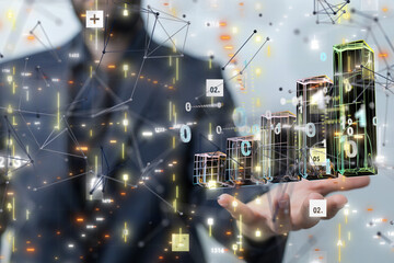 Futuristic digital map with financial indicators and analytics data streams, emphasizing global market trends