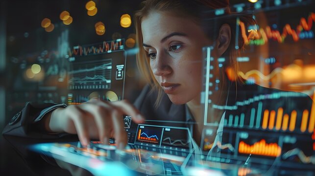 Businesswoman Interacting with Holographic Display Showcasing Global Market Data Analysis