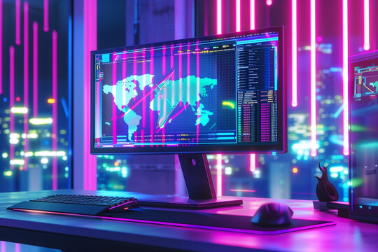 High-tech workspace with a global data map displayed on a computer screen against a backdrop of urban lights and neon illumination.