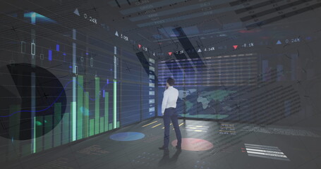 Image of statistics and financial data processing over businessman in office