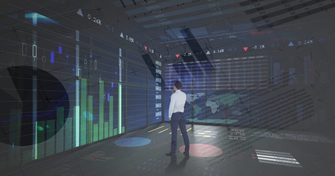 Businessman analyzing global financial data in high-tech office