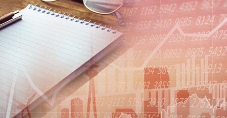 Composition of financial statistics processing and notepad in background