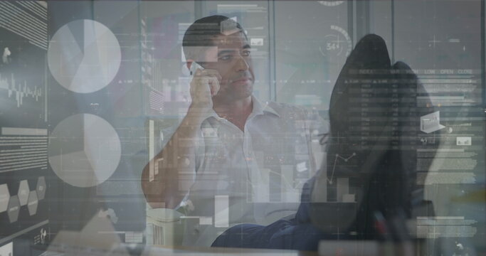 Image of statistics and financial data processing over caucasian man using smartphone