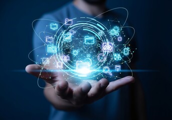 Hand holding glowing digital network with icons on dark background