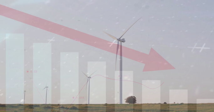Image of red arrow and financial data processing over wind turbines field in countryside
