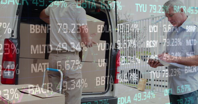 Image of financial data processing over delivery man loading up car outside of warehouse