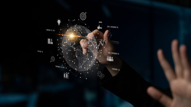 A professional analyzing global data on a digital dashboard, representing modern data science, analytics, and global connectivity.