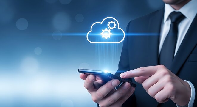 Businessman using smartphone with cloud technology and gears